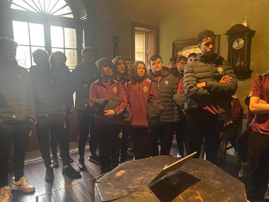 Last week our TY History students visited Wolfe Tone’s gravesite at Bodenstown Graveyard, Collins Barracks and the Pearse Museum in Rathfarnham. Highlights included the Barracks Life Room, experiencing reconstructions of soldiers’ quarters from the 19th and 20th centuries, Pearse’s office before the 1916 Rising and the Harry Clarke’s Stained Glass exhibition. This trip offered a unique opportunity to connect with Ireland’s path to independence and understand its impact at home and abroad.