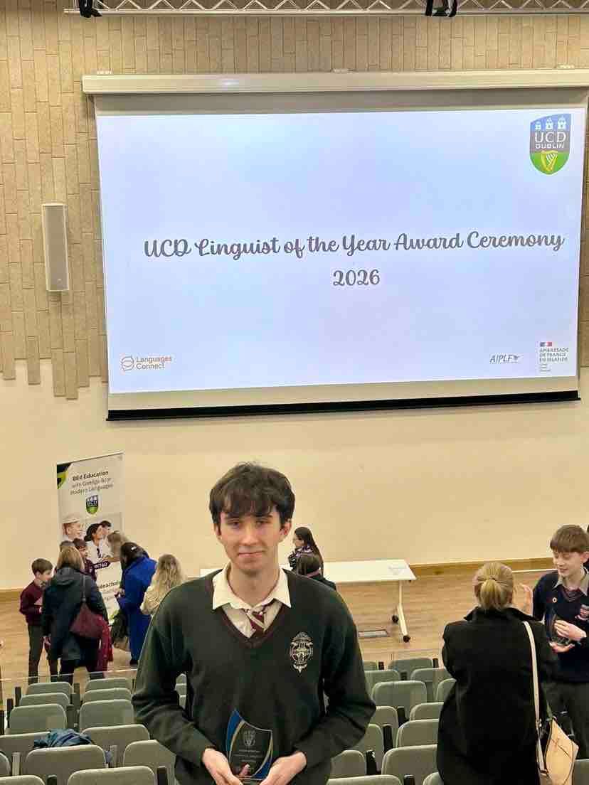 A huge congratulations to 6th year student Charlie Roberts, who received the UCD Languages Connect Award in the UCD Linguist of the Year competition. Charlie came 2nd nationally for his entry in French entitled “My World, My Language”