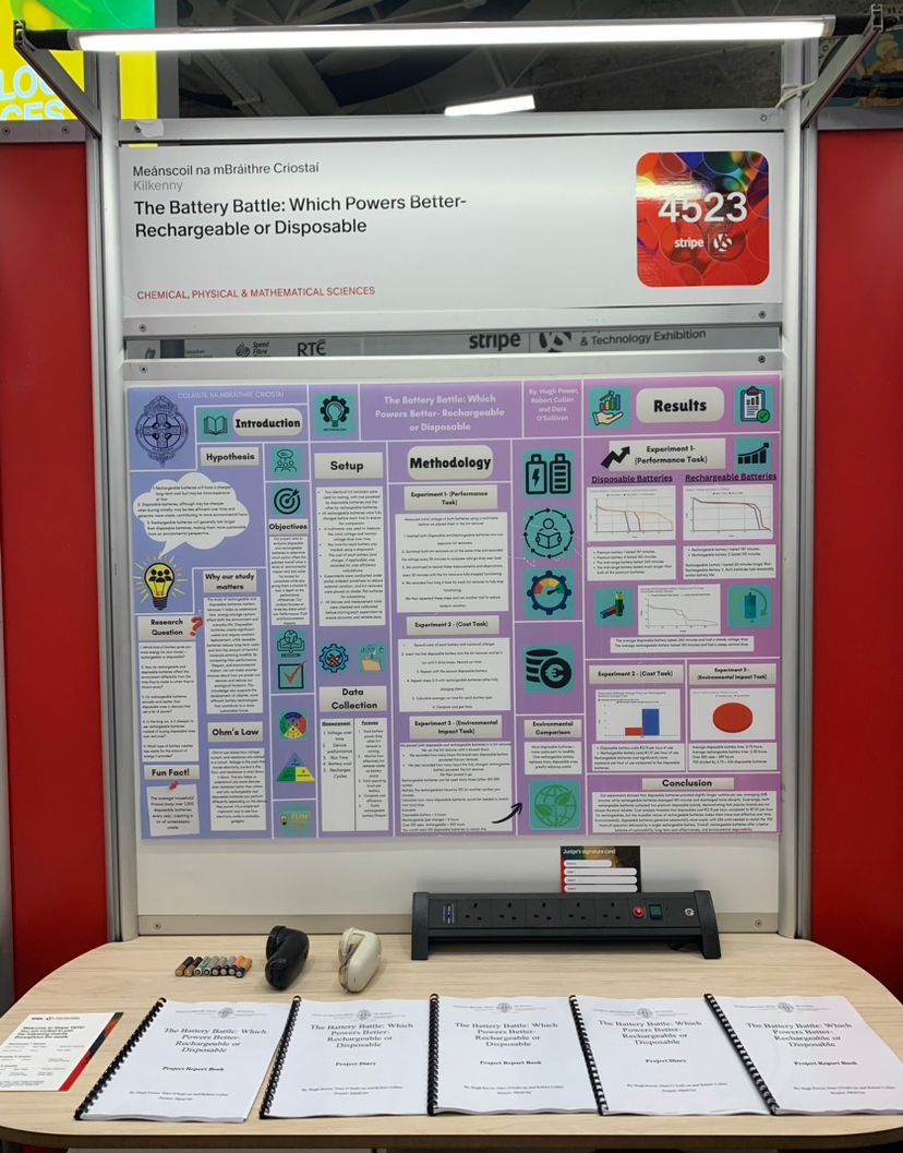 Transition year students Hugh Power, Robert Cullen and Dara O Sullivan travelled to Dublin today to participate in the Stripe Young Scientist and Technology Exhibition. The group will present their project – The Battery Battle: Which Powers Better- Rechargeable or Disposable, to industry experts as well as members of the public at the RDS over the next four days.
